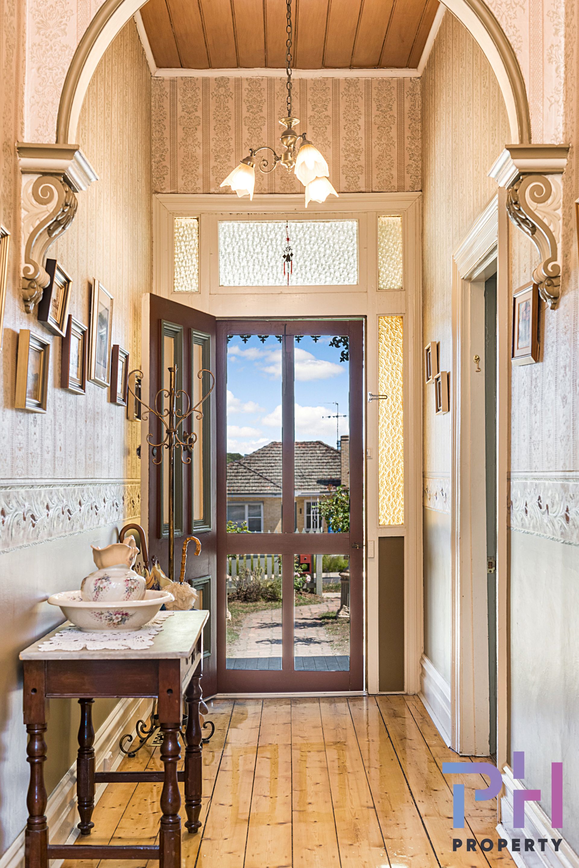 Walking through the front door you are immediately greeted with a spacious hall boasting ornate archway and embossed wall-paper, other features include lead-light glazed windows, high architraves, 3.6m pine-lined ceilings and polished Baltic pine floors.